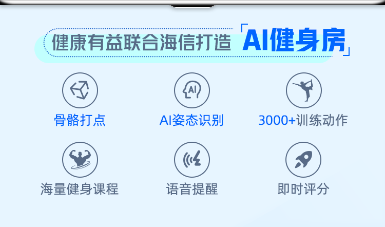 为此,健康有益e家携手海信电视,为5000万+家庭用户倾力打造居家“AI健身房”,通过AI健身与电视屏幕的结合,根据用户的自身情况,提供个性定制化的专业运动健康方案,包括健身跟练、动作矫正等。这一举措,在疫情期间为其带来了持续性用户增长,和良好的口碑。在强化了海信电视的AI社交、健康等属性的同时,也帮助其提升了综合竞争力。