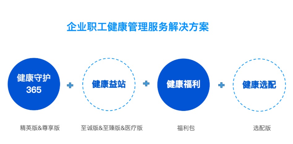 针对“后疫情时代”下企业在健康管理和有效防护的需求,健康有益探索实践出了全方位的一站式健康服务保障方案,不仅可以帮助企业建立员工数字健康档案,实现系统化、可视化管理,还可以利用大数据分析潜在健康风险,及时给出个性化、定制化的健康干预方案,包括【健康守护365】、【健康益站】、【健康福利包】、【健康选配包】等。