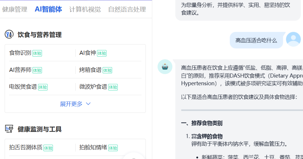 慢病管理场景:针对高血压、糖尿病、高血脂等慢性病患者,企业及医疗机构可通过AI智能体自动生成包含“禁食清单”“推荐食材”的膳食方案,实现高效的健康风险管控;