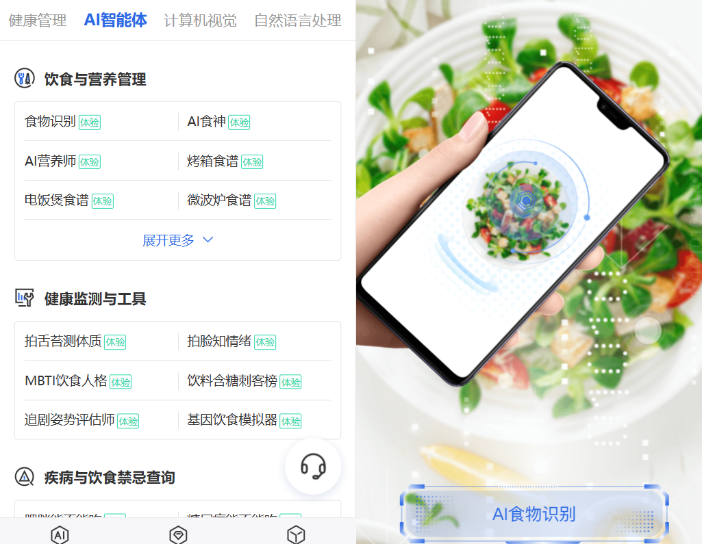 这些AI智能体既各司其职,又能实现跨场景交叉协同,而健康有益AI健康医疗大模型便是这一矩阵的智慧中枢。例如,用户使用食物识别智能体完成餐食分析后,结果实时同步给慢病饮食禁忌智能体,糖尿病患者收到红灯提醒,自动替换为低GI食谱,实现从“识别-干预-反馈-优化”闭环。