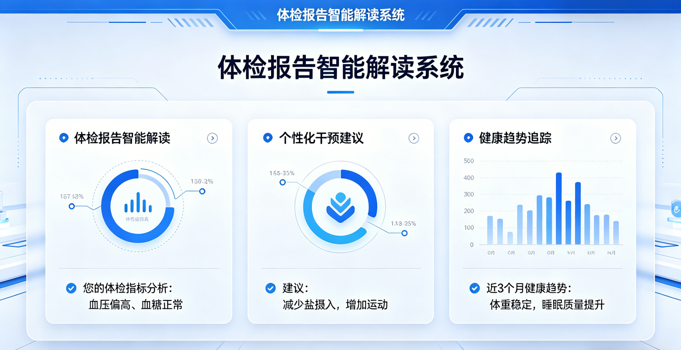 在政企数字化转型与健康管理精细化的双重驱动下,传统体检报告数据分散、术语晦涩、难以解读、无法追踪的痛点日益凸显。健康有益的体检报告智能解读系统,以AI技术打通体检数据“采集—解析—评估—干预—追踪”全链路,将静态报告转化为动态健康洞察,为政企客户提供从个人解读到群体管理的一站式解决方案,成为企业员工健康、保险核保、公共卫生监测的核心数字化工具。