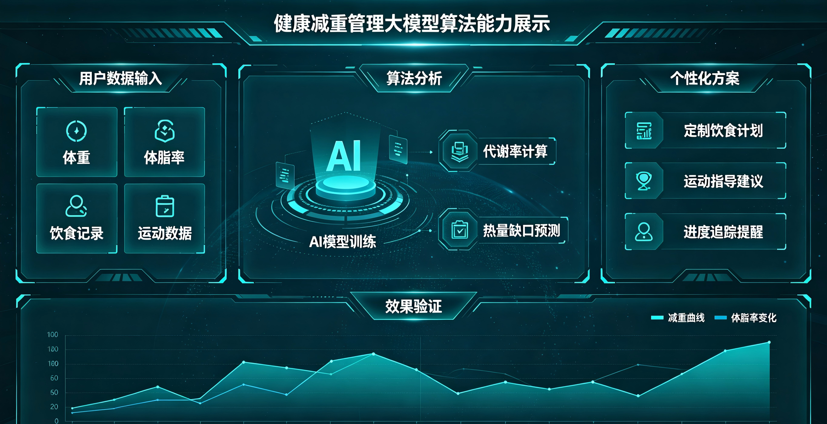 智能评估引擎:通过身高、体重、体脂率等基础数据生成用户健康数字孪生体,结合对话引导分析肥胖风险,输出体重趋势、减重目标达成率及健康风险预警,支持周期性评估。